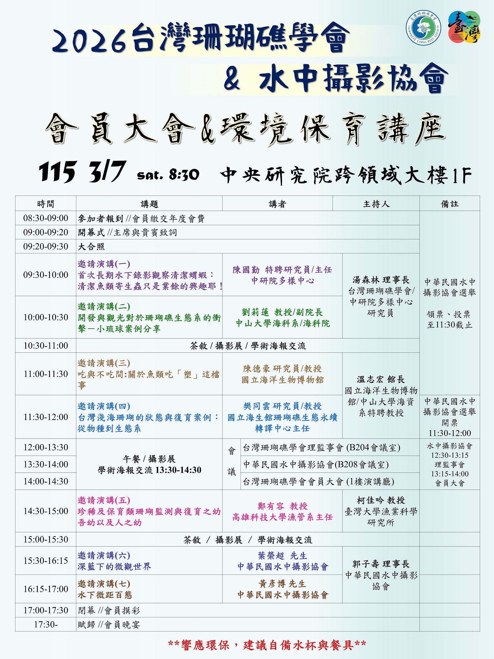台灣珊瑚礁學會(TCRS)與中華民國水中攝影協會(UPAT)將於 2026 年共同舉辦會員大會暨海洋環境講座,誠摯邀請會員及關心海洋環境的各界人士踴躍參與。